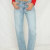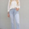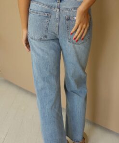 Mid-rise, with a straight leg that bows at the knees for an arched, barrel leg silhouette. Ankle length crop with a clean hem.
