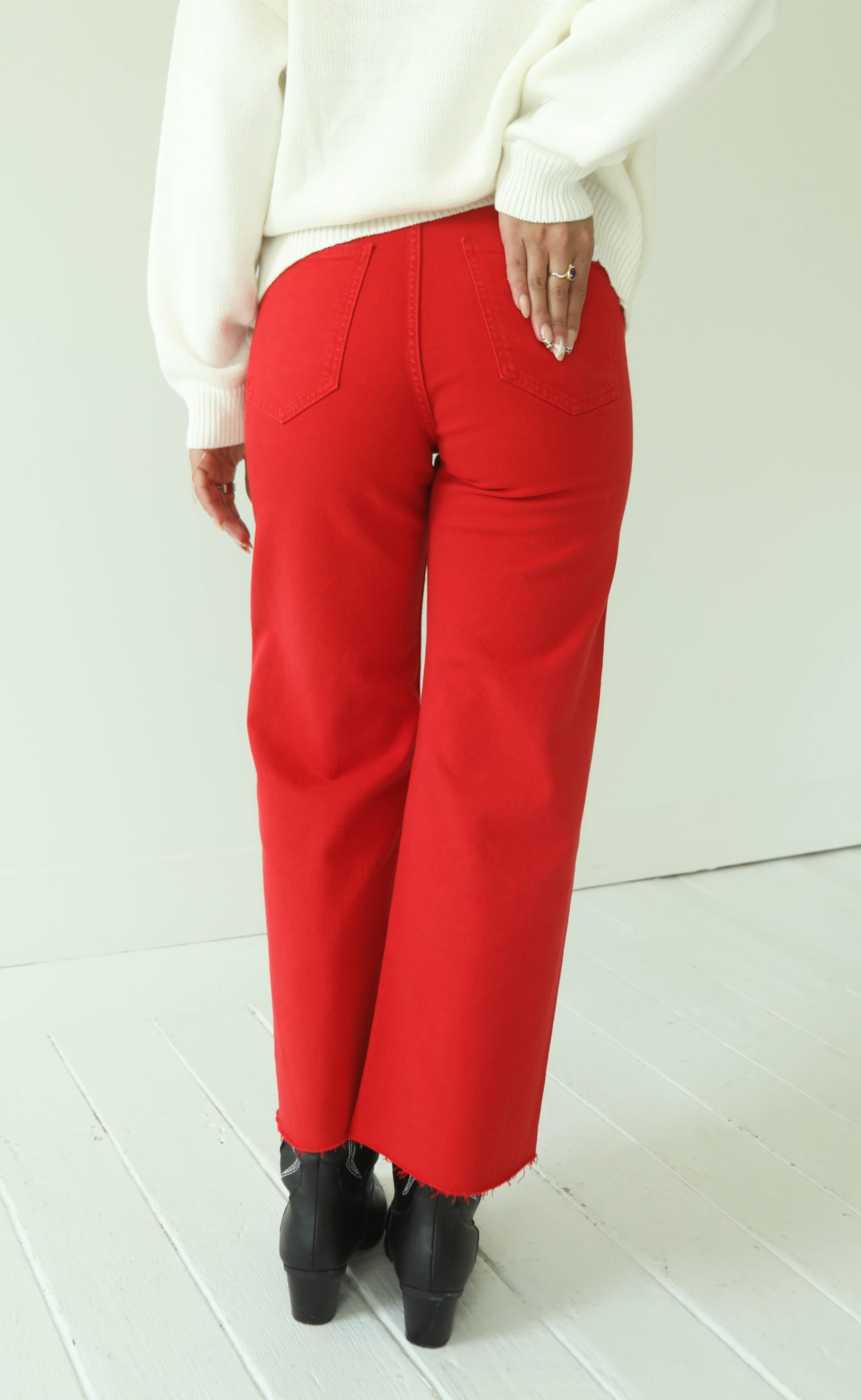 The Pistola Penny Crop high-rise jeans in ruby red offer a trendy wide-leg silhouette with a flattering cropped length. Finished with raw hems, these statement jeans add a touch of softness.